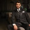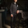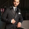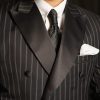 Costum White Strips Ceremony cu sacou rever șpiț lat negru și pantalon, realizat dintr-o țesătură premium din lână 100%. Sacoul cu două rânduri de nasturi, inspirat din ținutele gangstărilor italieni a devenit popular în zilele noastre și este purtat de marile vedete ale lumii. Datorită reverului negru din mătase și lână acesta se pliază pe evenimente elegante si totodată este o țesătură indrăzneață datorită dungilor albe.